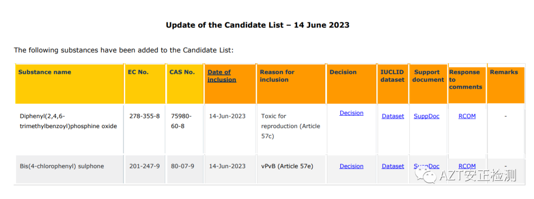 2023年6月14日,欧洲化学品管理局(ECHA)正式公布将(2,4,6-三甲基苯甲酰基)二苯基氧化膦、4,4'-二氯二苯砜纳入第29批SVHC候选清单。至此,REACH高度关注物质(SVHC)清单正式更新至235项。